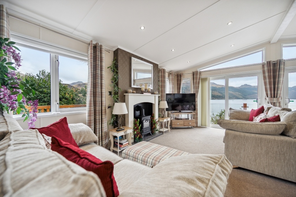 This 40ft x 20ft two-bedroom lodge features an open-plan living area with double sliding doors to the front leading to the generous front decking creating a sense of spaciousness and benefitting from the stunning open Loch Goil views . The living area includes two sofas focal point fire place with inset electric style stove.
