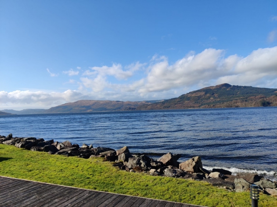 Twin bedroom with window to one side with partial loch view .